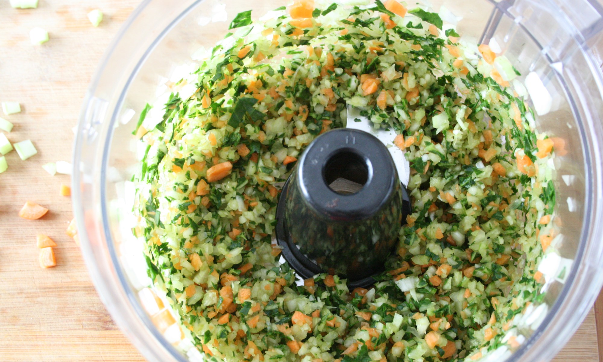 Dans la jarre du robot culinaire, faire une mirepoix de légumes avec l’oignon, le céleri, les carottes et la bette à carde. Si vous n’avez pas de robot, assurez-vous de tout couper en petits dés