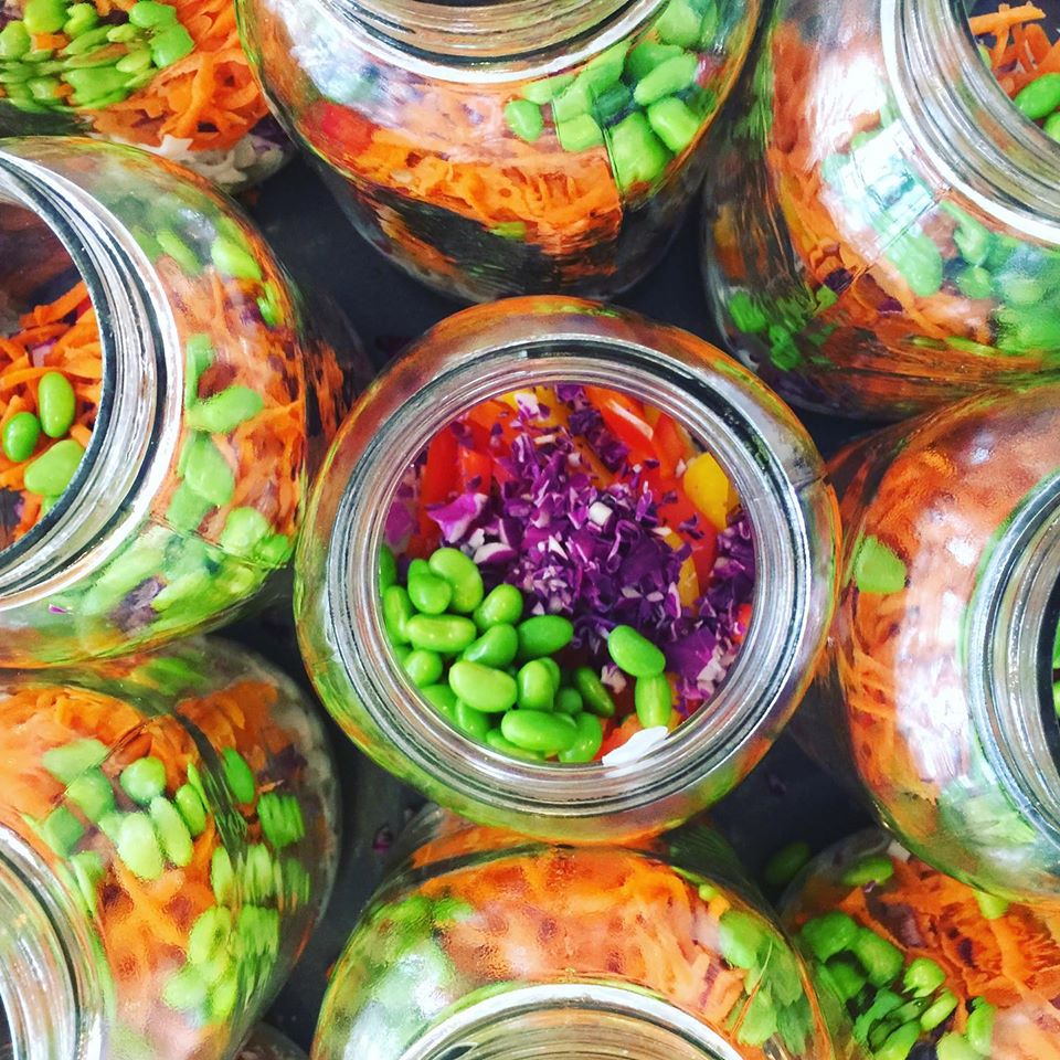 Salade gourmandes en pots Mason. 3 choix de salades à chaque semaine (1 choix végétalien & sans gluten). Récupère les pots mason.